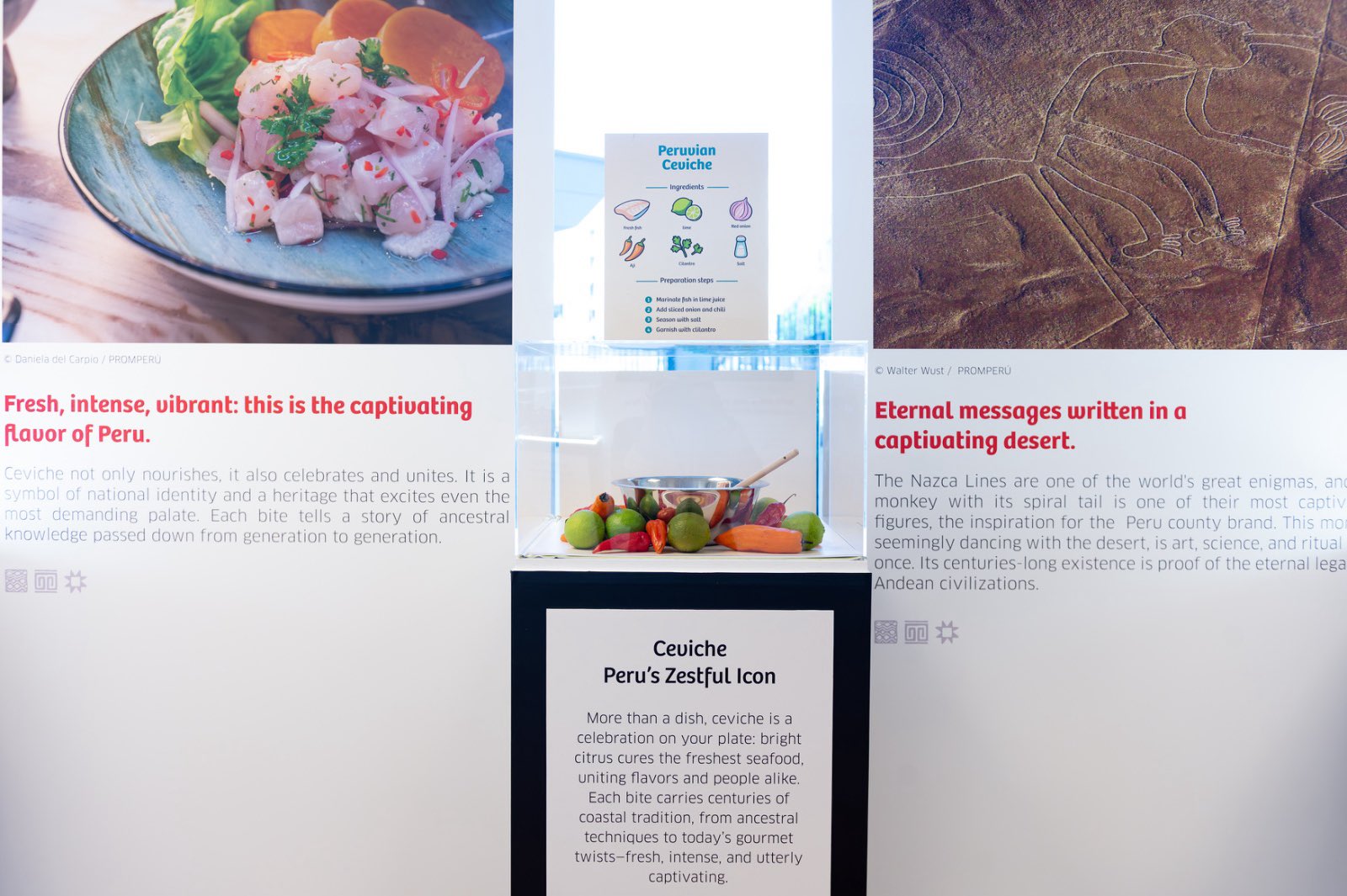 A través de una cuidada exposición, presentaciones de danzas tradicionales y una muestra gastronómica que incluyó el emblemático ceviche, con un cooking show, y pisco sour, el evento destacó cómo la Marca Perú promueve la imagen del país a nivel nacional e internacional, impulsando el turismo, la cultura, la gastronomía, la producción nacional y las oportunidades de inversión.